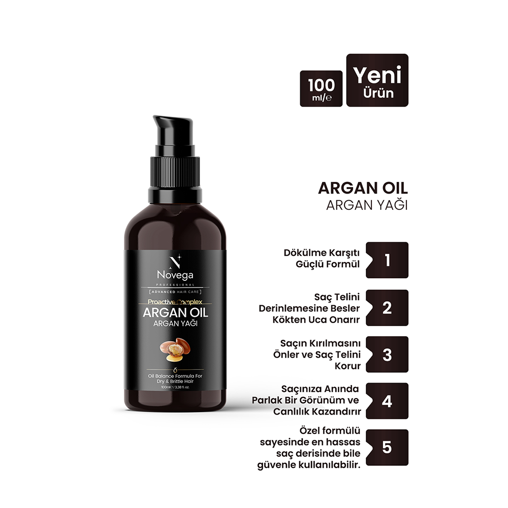Novega Argan Yağı Proactive Kompleks, ve kırılmasını önlemeye yönelik özel formülü ile saçlarınızda devrim yaratır. İçeriğindeki saf Argan Yağı ve Proactive Kompleks, saç köklerinizi güçlendirir, kırılmaları engeller ve anında sağlıklı bir parlaklık kazandırır. Saçlarınızın doğal güzelliğini ve gücünü geri kazanmasını sağlar. Hızla emilen, hafif yapılı formülü ile günlük bakım rutininize mükemmel bir katkı sağlar.